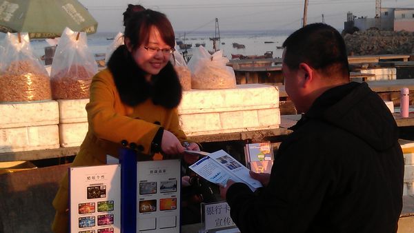 兴业银行大连旅顺支行选择在当地人流密集的盐场海产品市场进行银行卡助农取款宣传。通过设立宣传台、摆放宣传资料、现场讲解等方式,向海产品摊位业主及过往居民讲解助农取款、银行卡POS刷卡、ATM取款等相关业务知识。